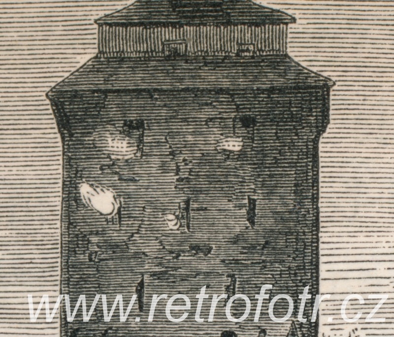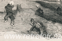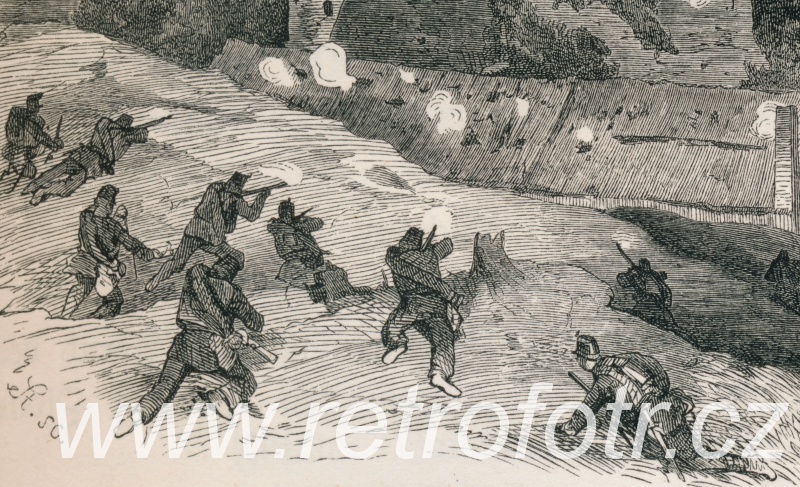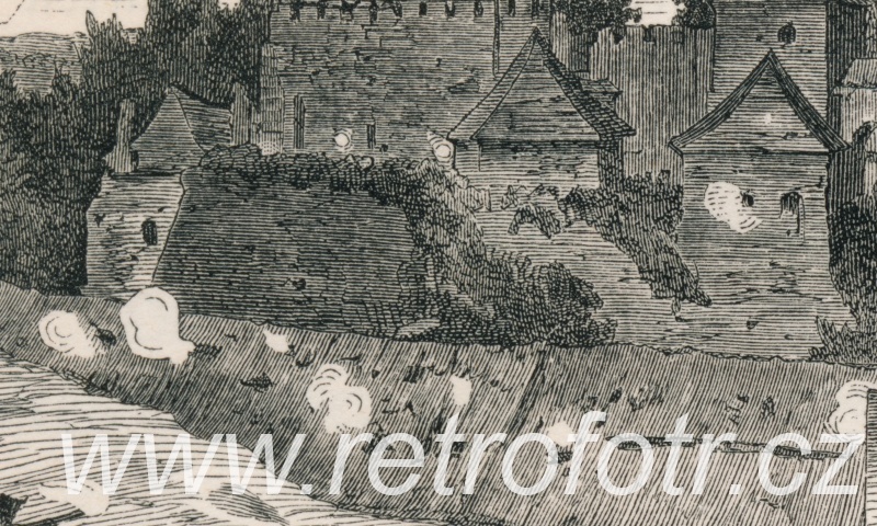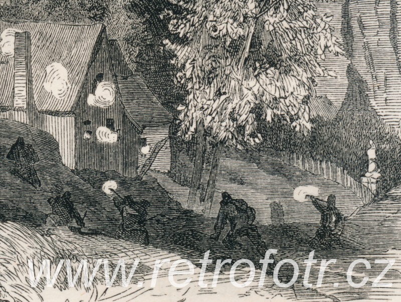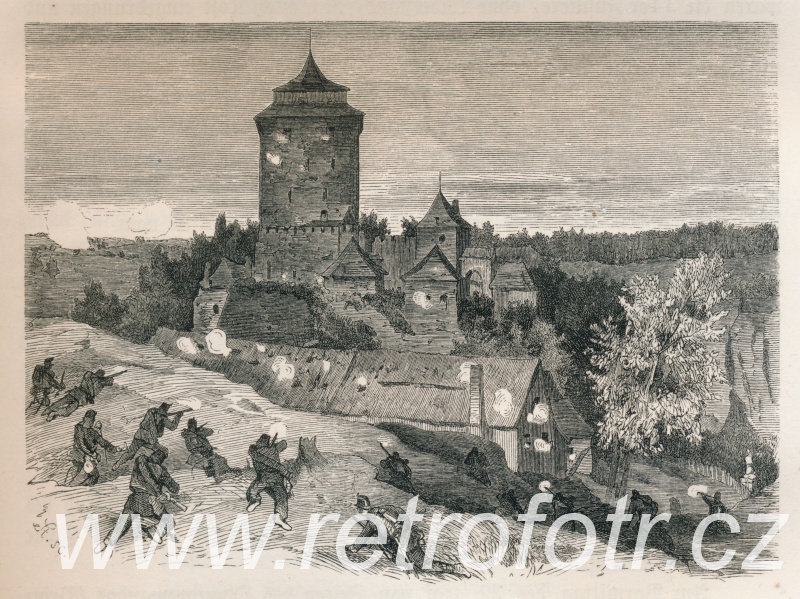Dobové vyobrazení střetu rakouských a pruských vojáků o gotický hrad Kost během války 1866.