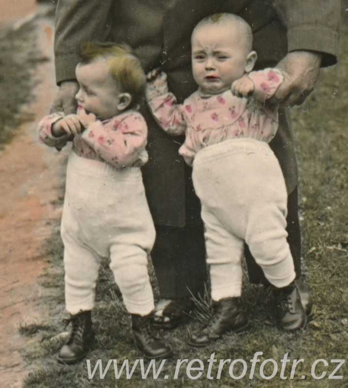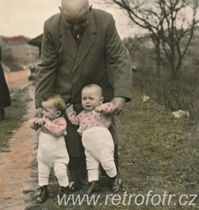 Fotografie dědy s dvojicí dítek na kolorovaném snímku. Zhruba třicátá léta.