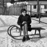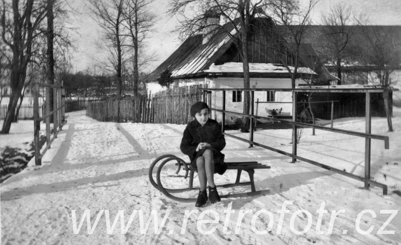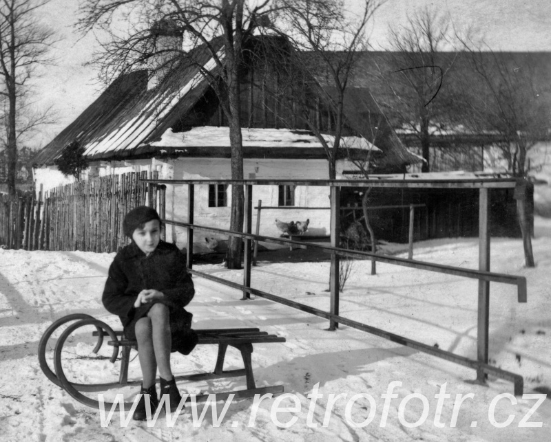 Zimní snímek dívky na sáňkách před chalupou. Odhaduji na dvacátá až třicátá léta.