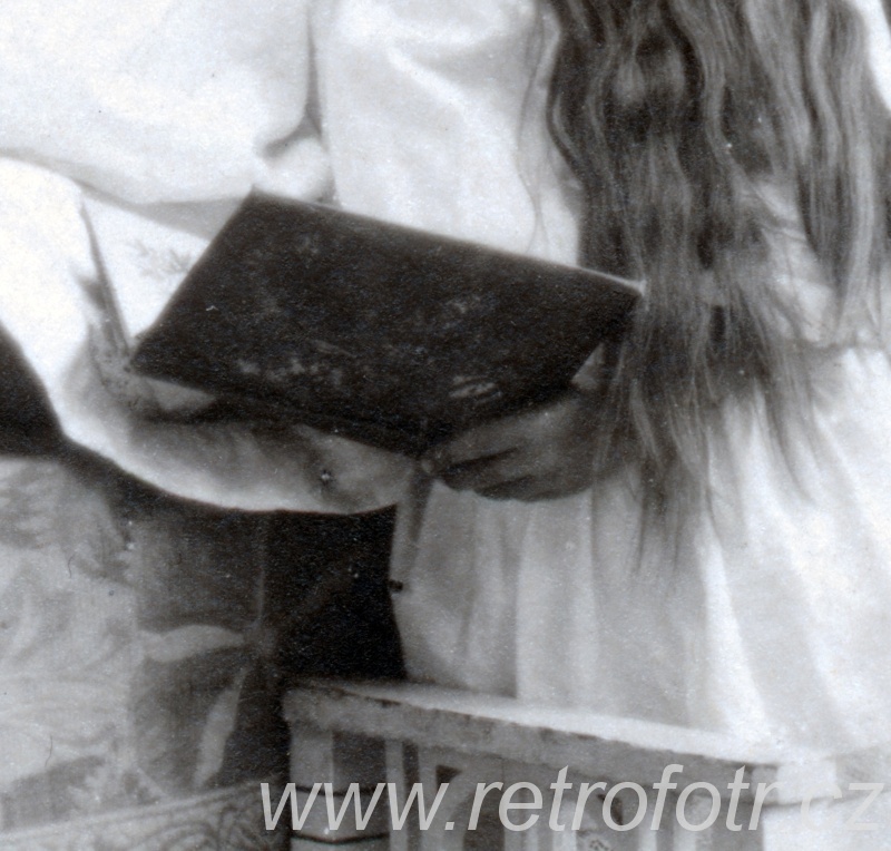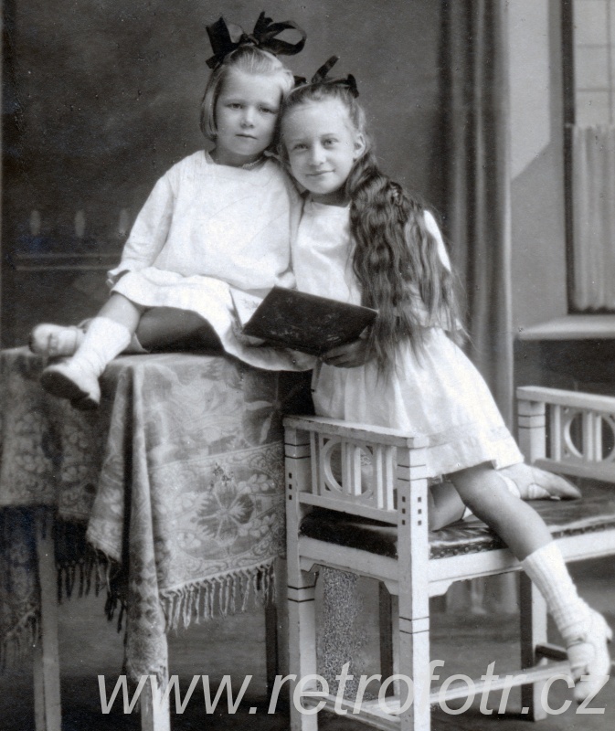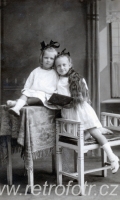 Ateliérový snímek děvčat s otevřenou knihou. První republika, možná starší. Náchod.