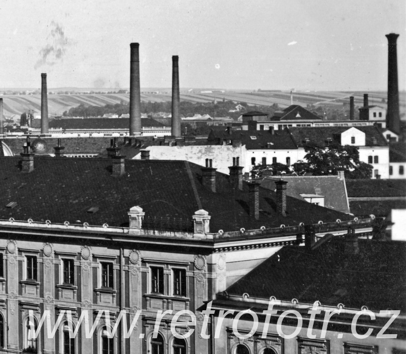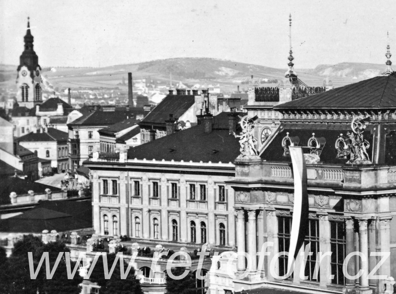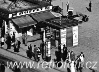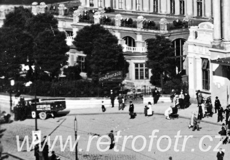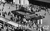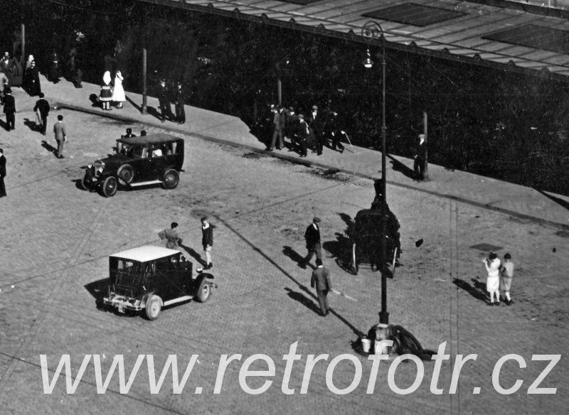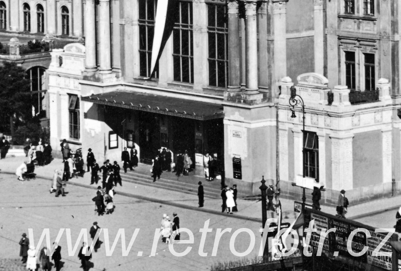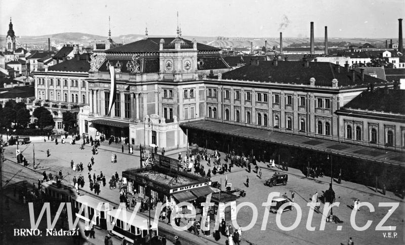 Pohled na dění před vlakovým nádražím v Brně. První republika.