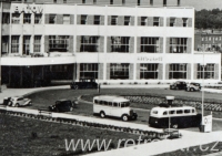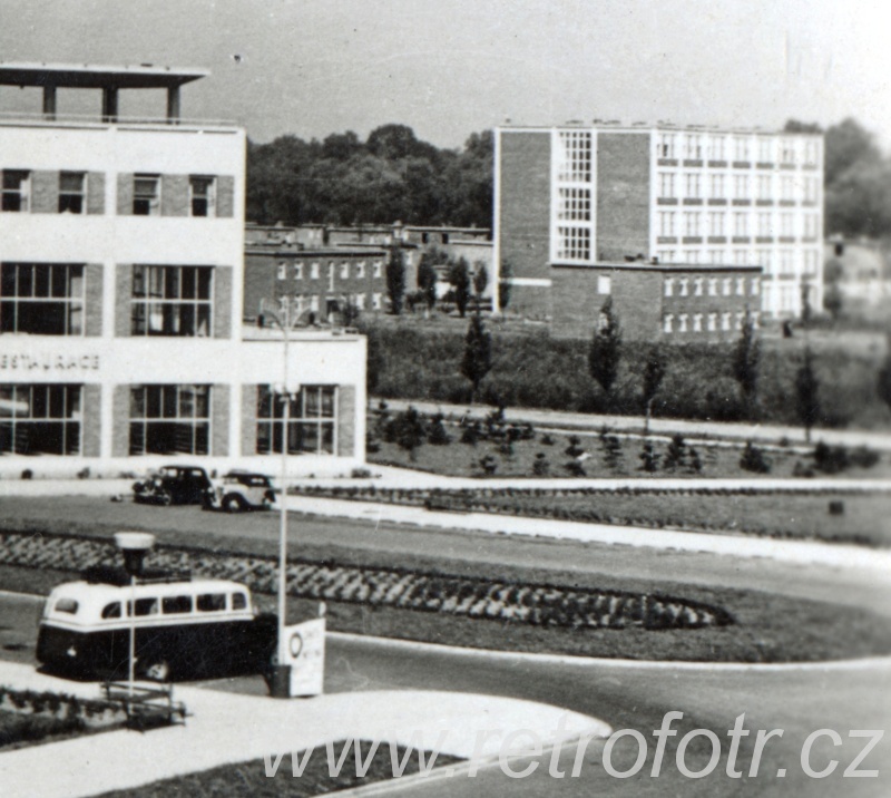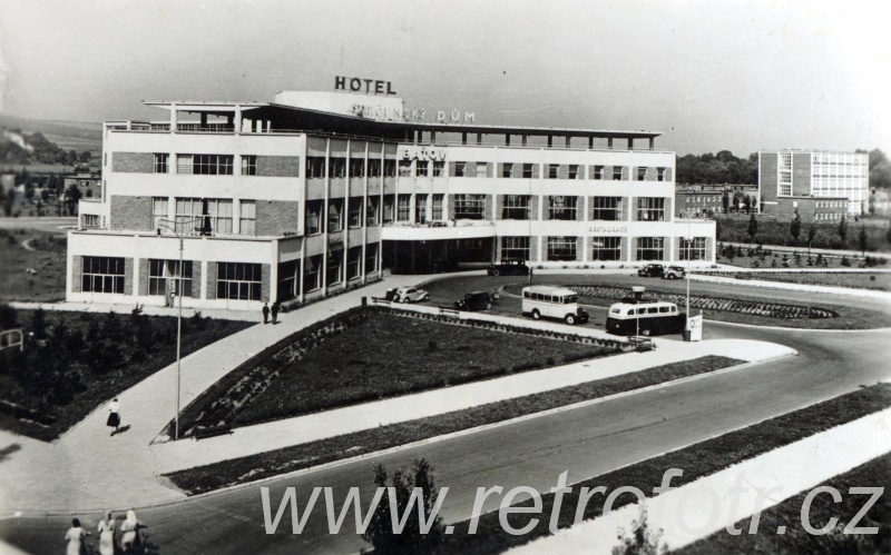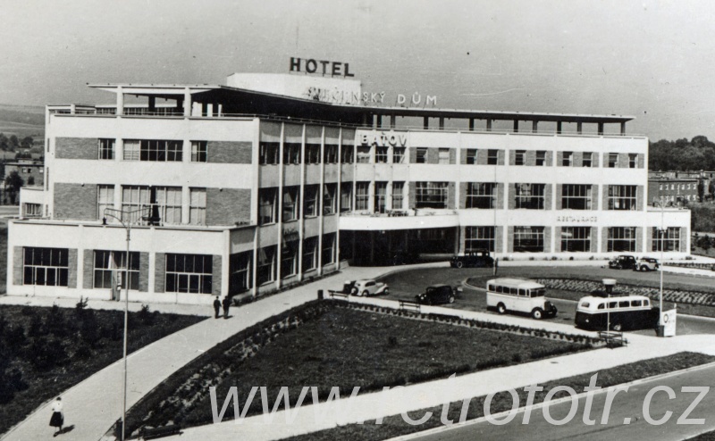 Snímek hotelu a společenského domu v tehdejším Baťově, dnes na území Otrokovic. Čtyřicátá léta.
