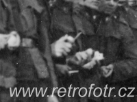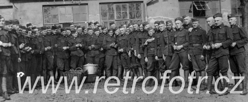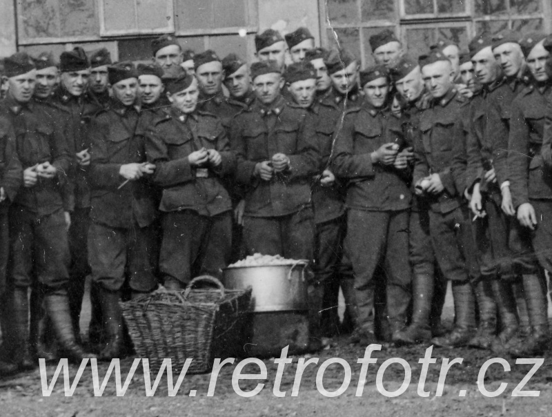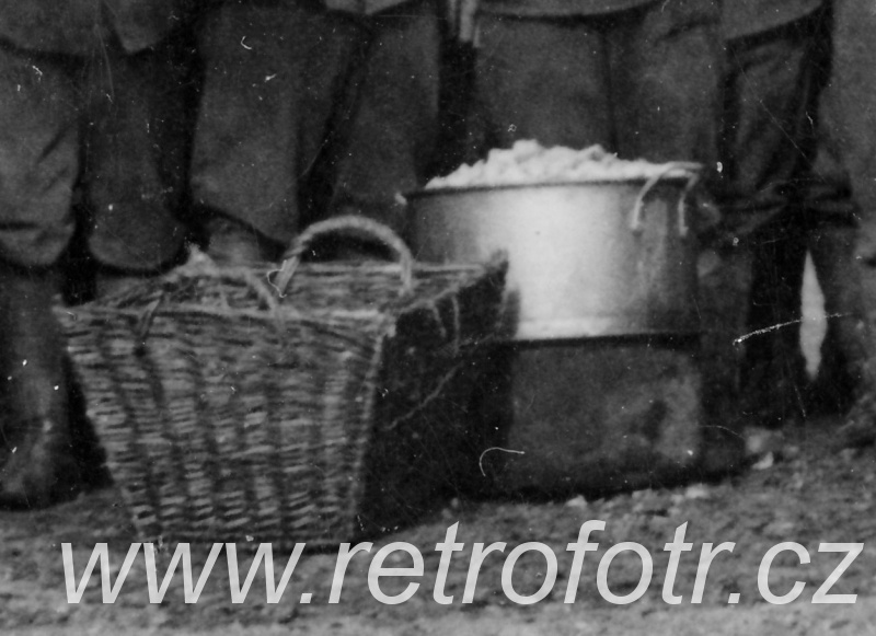 Společné škrábání brambor vojáky prvorepublikové armády. Třicátá léta.
