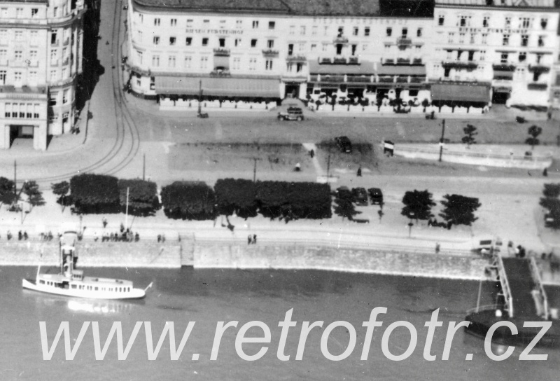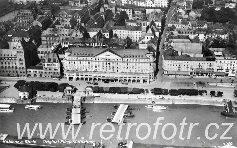 Letecký pohled na město Koblenz na Rýnu. Dvacátá až třicátá léta.