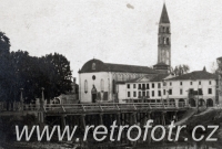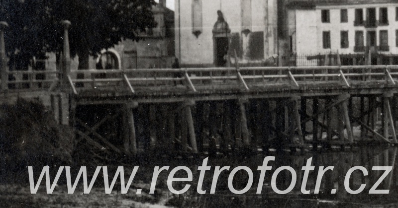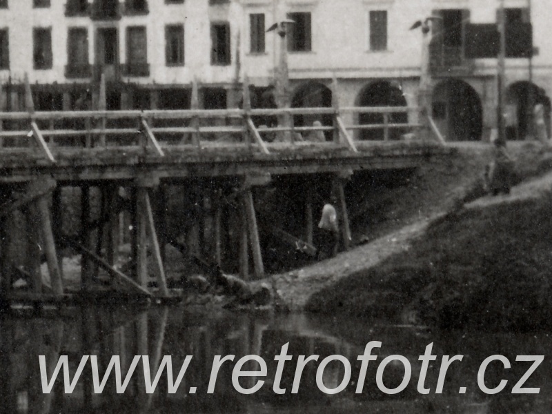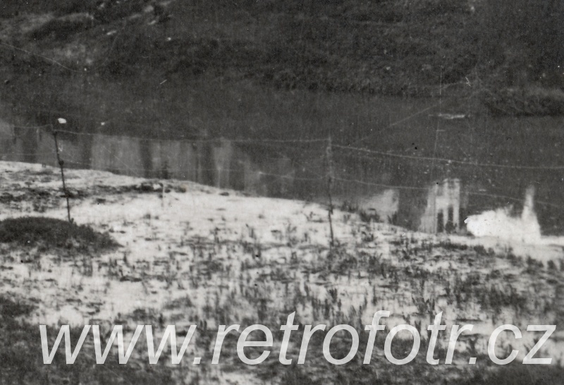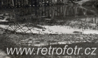 Snímek dřevěného mostu a břeh řeky s nataženým ostnatým drátem. Kdesi za První světové války, pravděpodobně v Itálii.