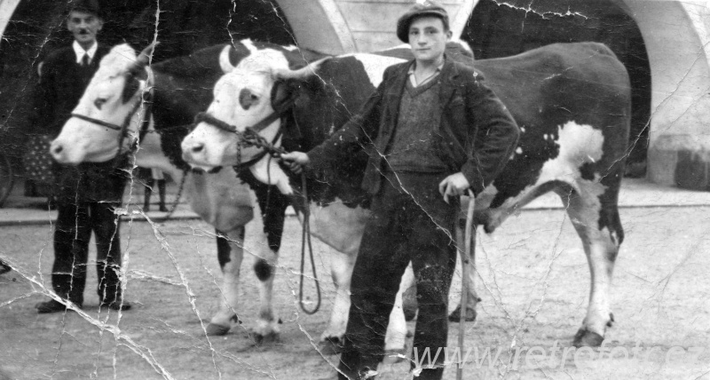 Snímek páru volů na náměstí s podloubím. Odhadem třicátá až čtyřicátá léta.