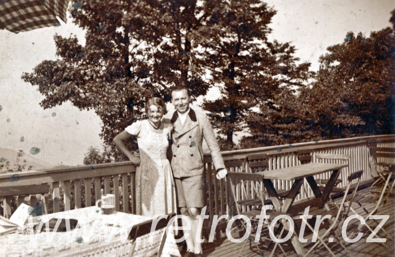 Snímek páru na letní terase restaurace. Třicátá až čtyřicátá léta.