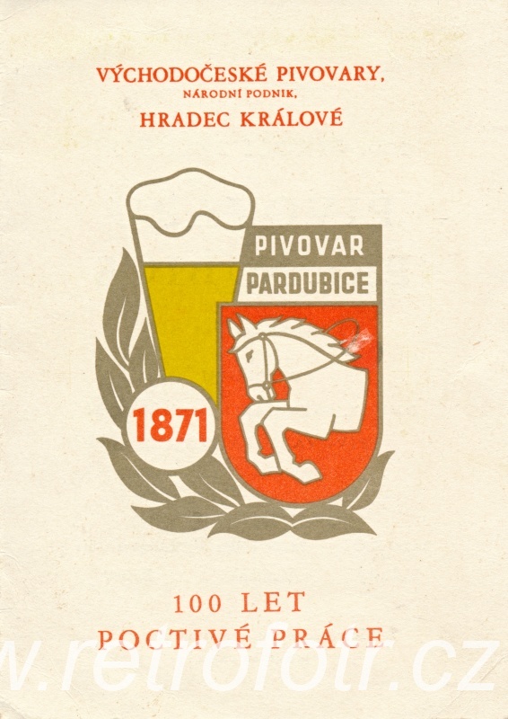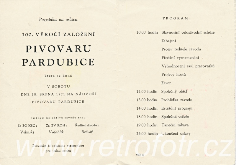 Pozvánka na oslavy stoletého výročí založení Pivovaru Pardubice. Rok 1971.