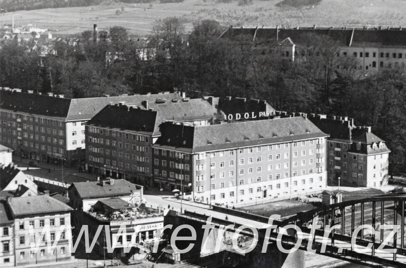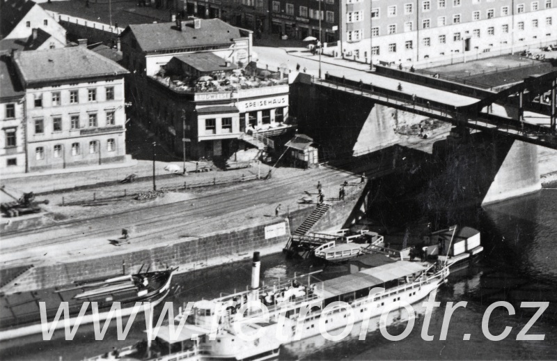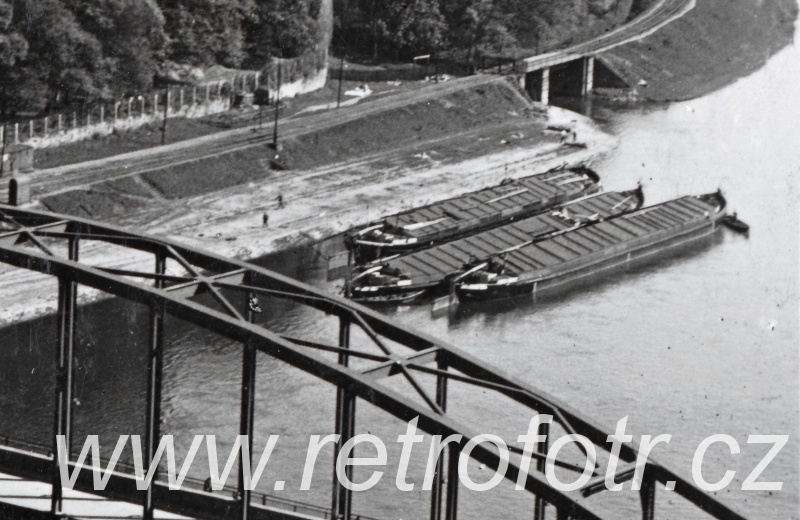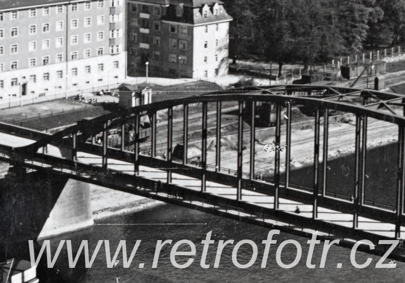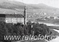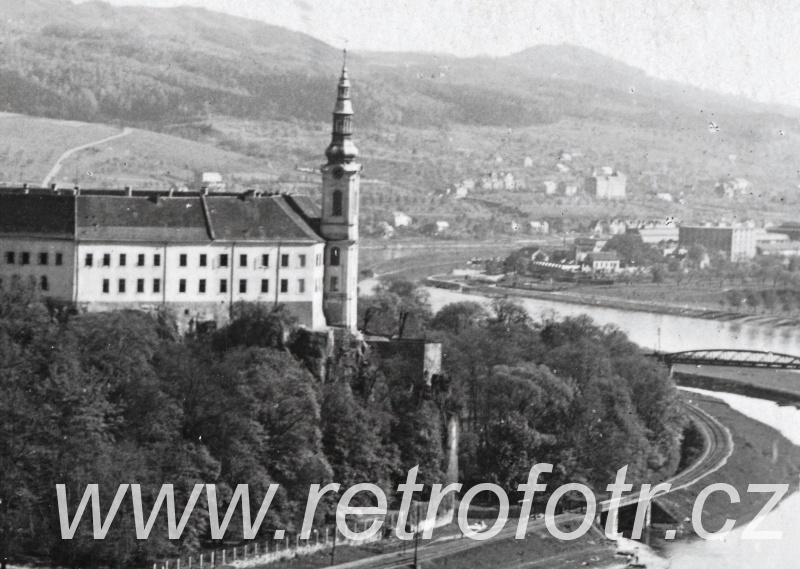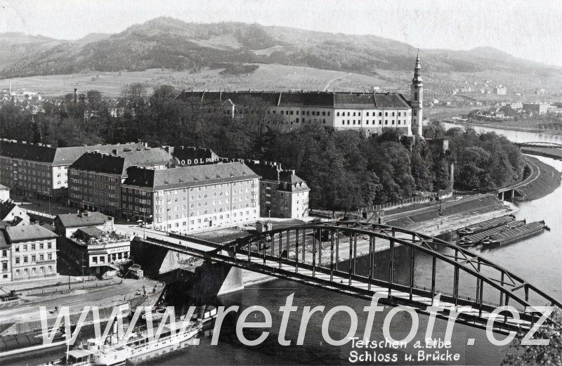 Snímek děčínského zámku a mostu přes Labe. Třicátá léta.