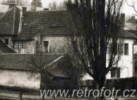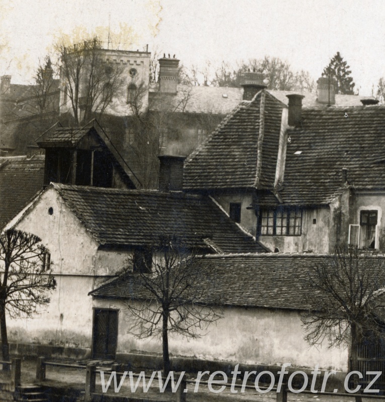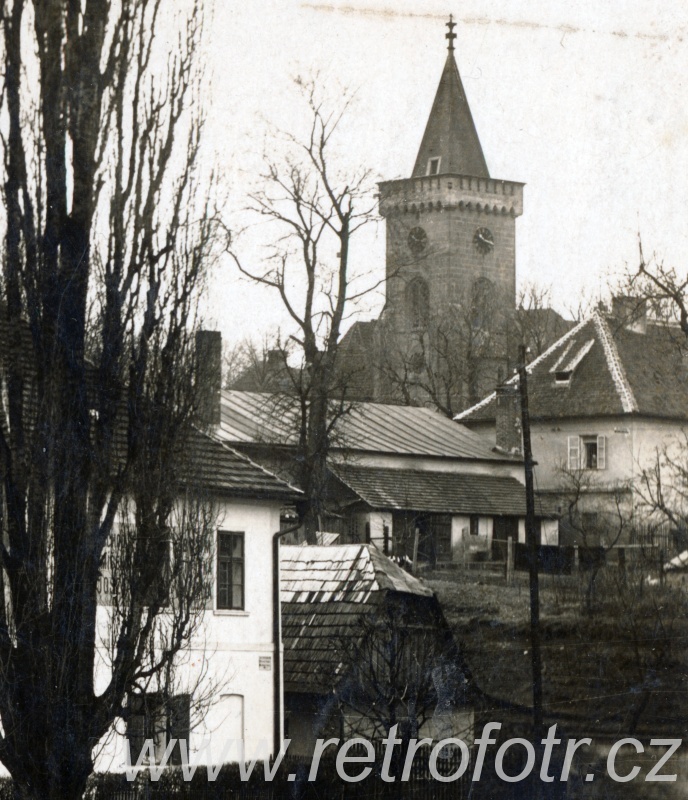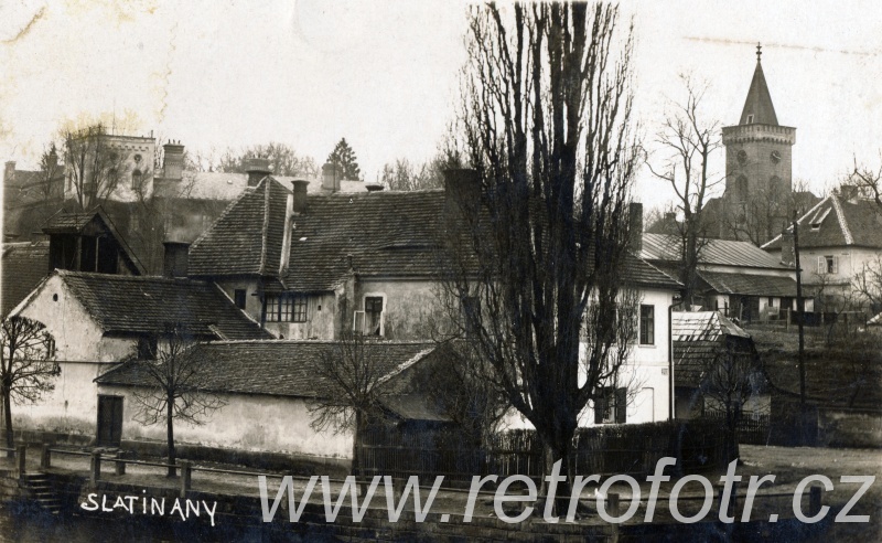 Snímek Slatiňan s kostelem a střechou zámku. První republika.