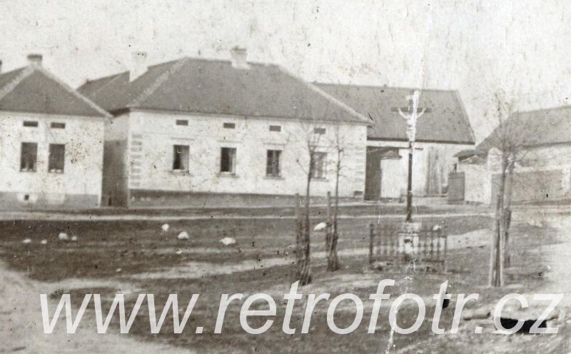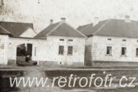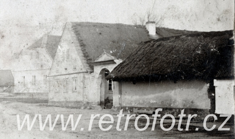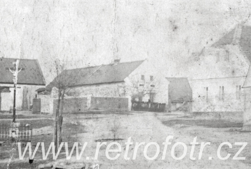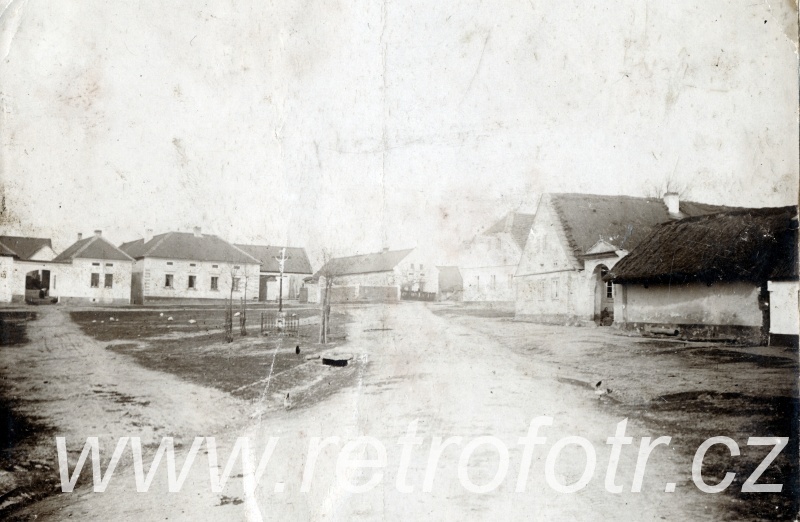 Snímek staročeské návsi. Odhaduji na druhou polovinu 19. století.