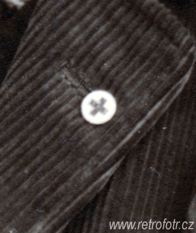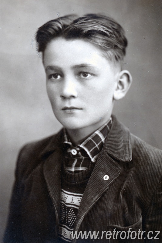 Ateliérový snímek chlapce s odznáčkem v klopě. Zhruba čtyřicátá léta.