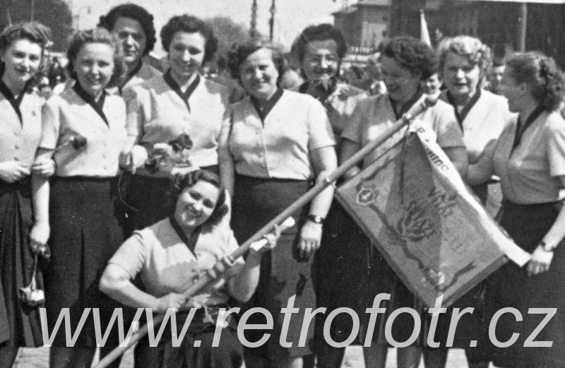 Snímek pracovnic Pragoděvu Praha - Libeň zřejmě při oslavách svátku práce. Padesátá až šedesátá léta.