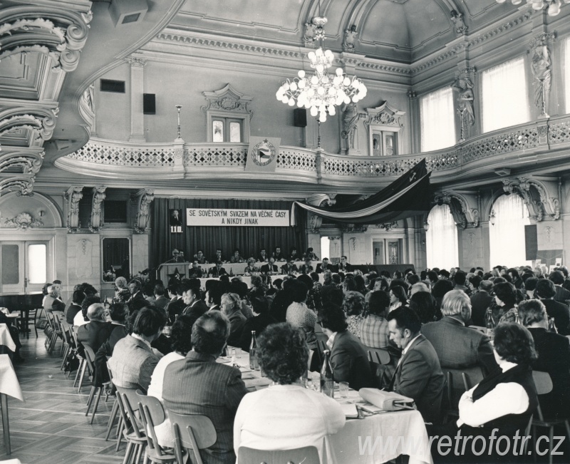 Na věčné časy a nikdy jinak. Fotografie ze setkání členů Svazu československo-sovětského přátelství v Chrudimi. Protože u fotografie V.I. Lenina je numero sto deset, jde o rok 1980, vůdce proletariátu se totiž narodil 1870. Hezký sál to mají Chrudimští...
