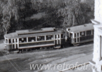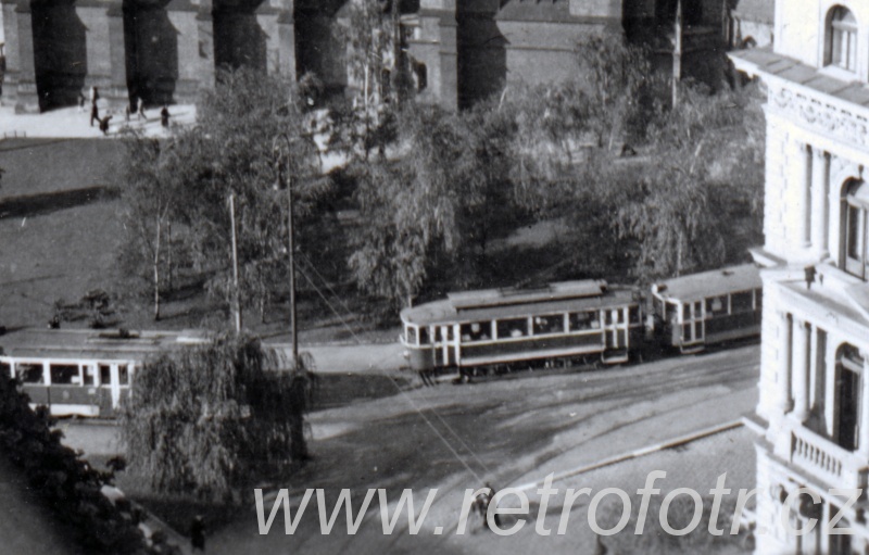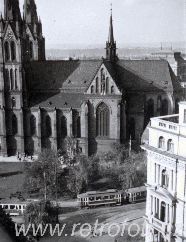 Pohled seshora na tramvaje na Vinohradech u kostela sv. Ludmily. Třicátá až čtyřicátá léta.