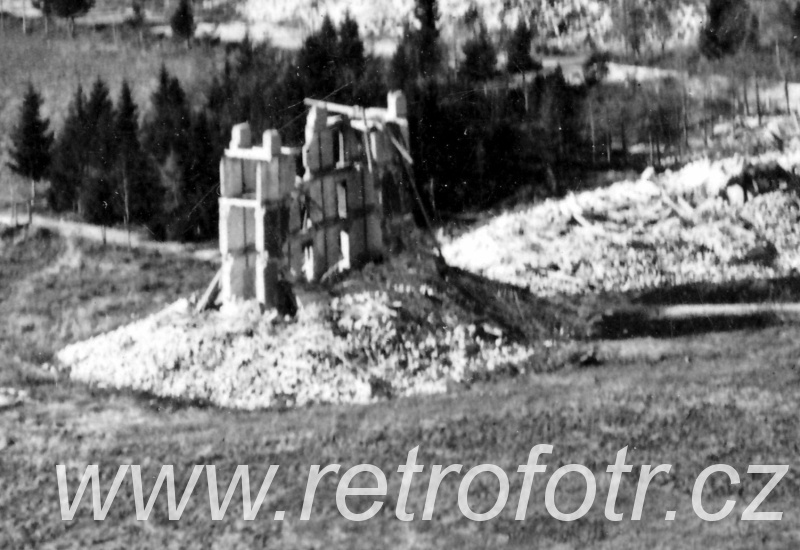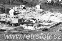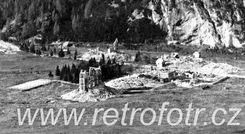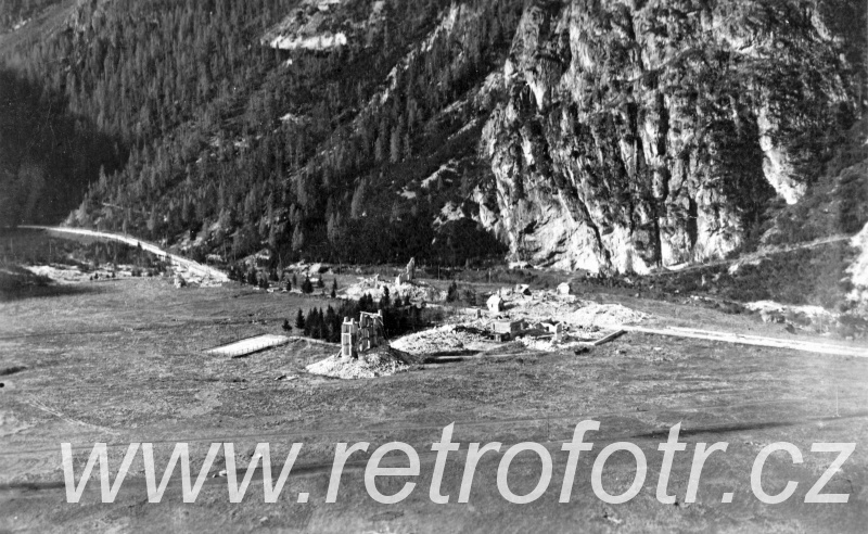 Pohled na trosky zástavby z jednom alpských údolí, pravděpodobně Landro. První světová válka.
