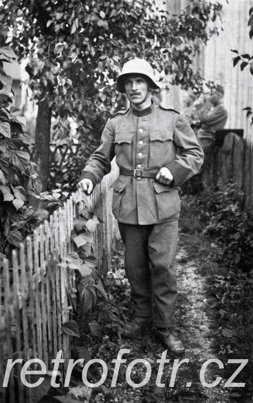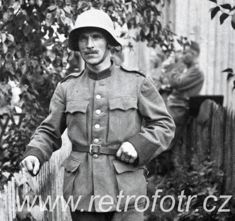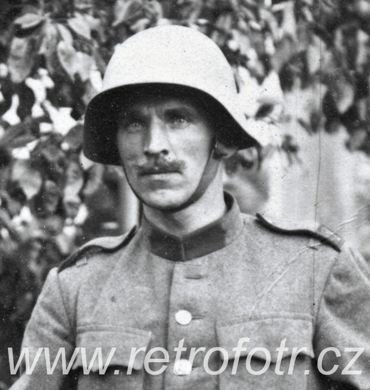 Snímek vojáka v helmě. Fotografie odeslaná v roce 1919 do Švýcarska.