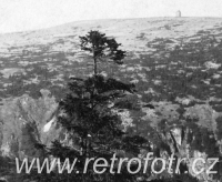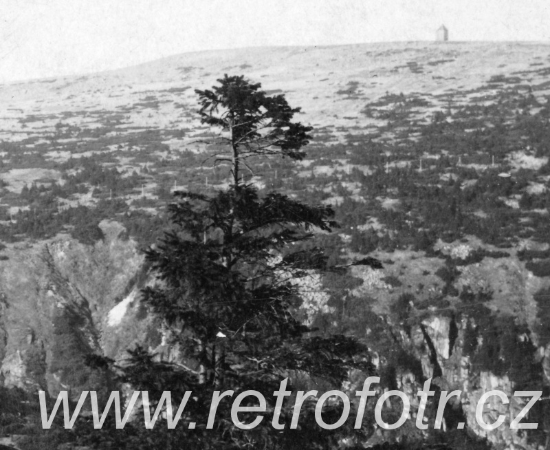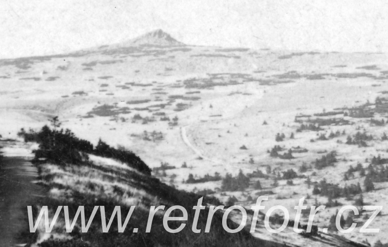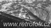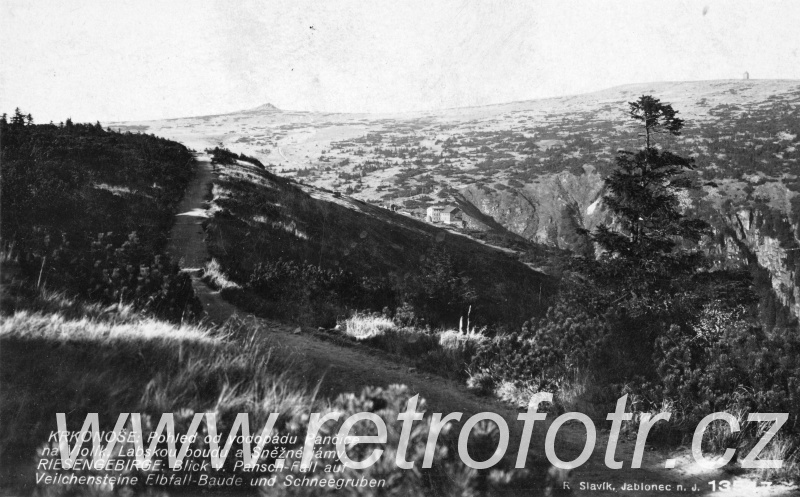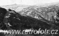 Snímek z Krkonoš, výhled na Labskou boudu. Třicátá léta.