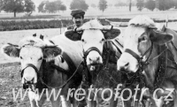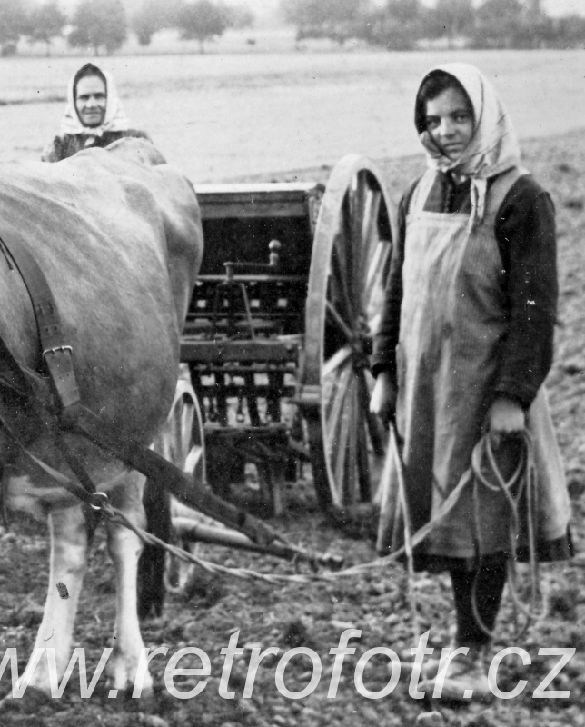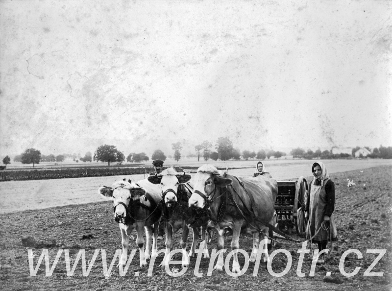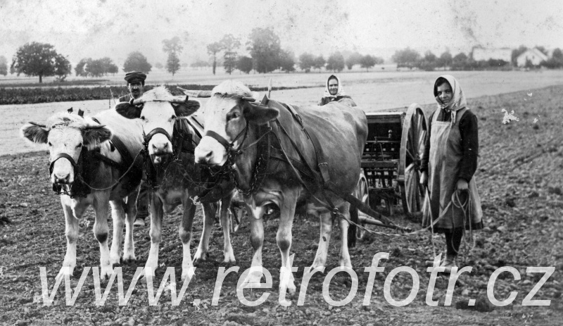 Snímek z polních prací a sečkou taženou dobytkem. Dvacátá až třicátá léta, Polabí.